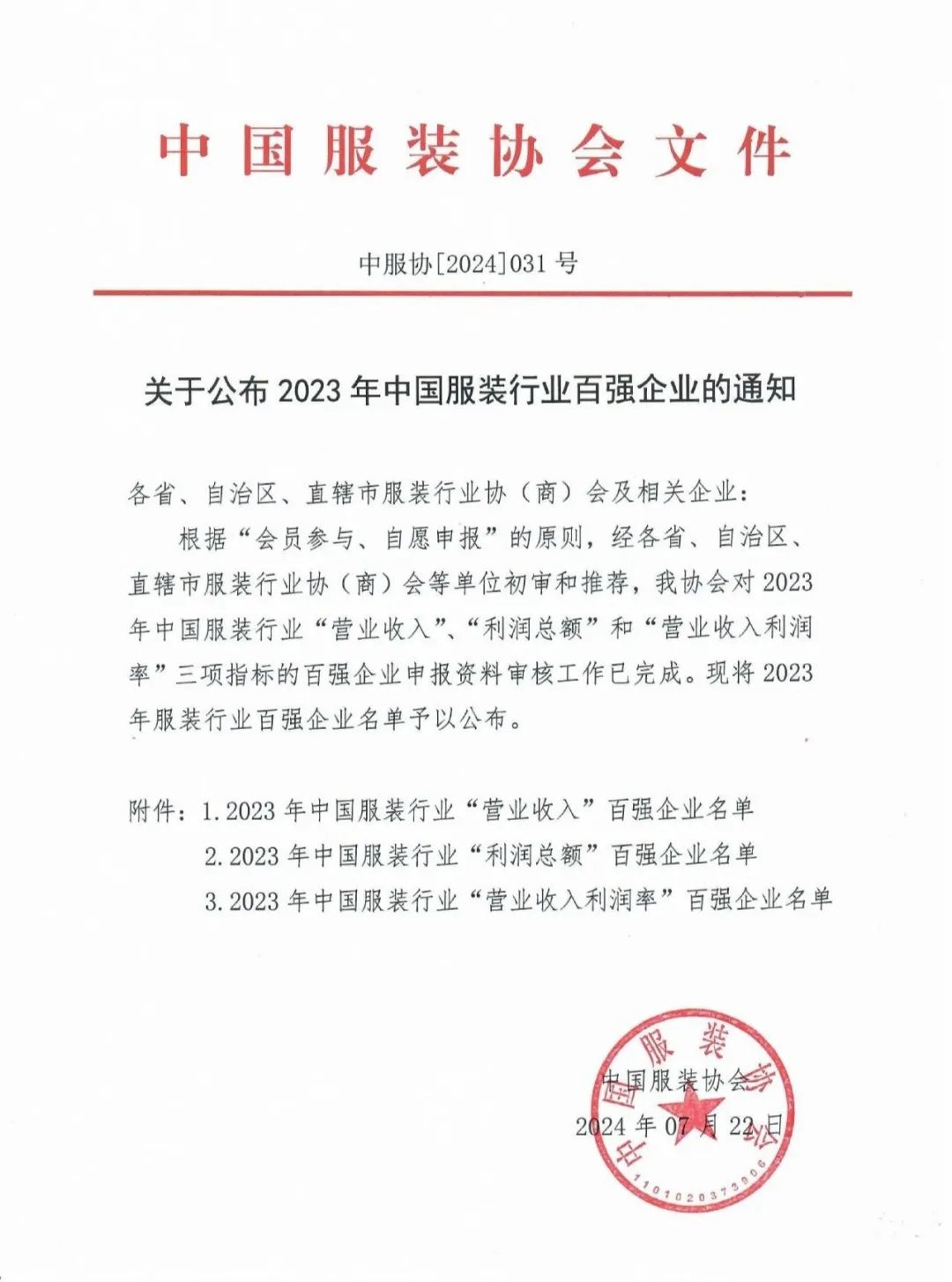 【概要描述】中國服裝協會正式發布2023年度“中國服裝行業百強企業”名單,泰慕士3項指標全部上榜分列第88、76和72位